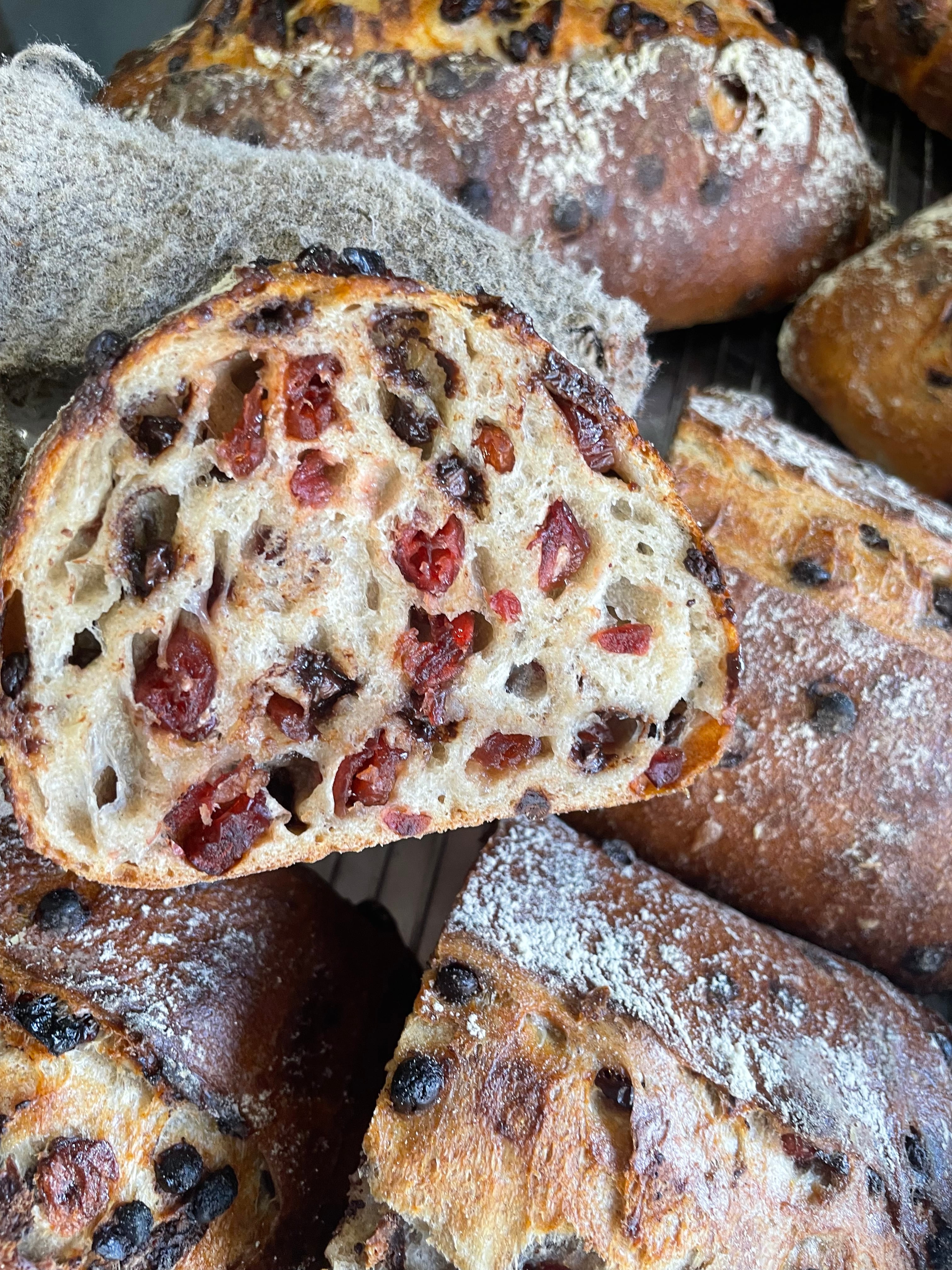 クランベリーとチョコチップをたっぷり入れて、じっくり焼きこみました。